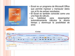 Este documento proporciona una introducción básica a Microsoft Excel, incluyendo una descripción de sus principales características y herramientas. Explica conceptos como hojas de cálculo, celdas, formatos numéricos, funciones matemáticas, referencias, errores comunes y más. También incluye instrucciones paso a paso para completar ejercicios prácticos en una hoja de cálculo de ventas.
