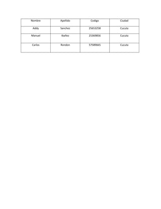 La tabla contiene los nombres, apellidos, códigos y ciudades de tres personas. Addy Sánchez, Manuel Ibañez y Carlos Rondón son de Cucuta y sus códigos son 25653258, 25369856 y 57589665 respectivamente.