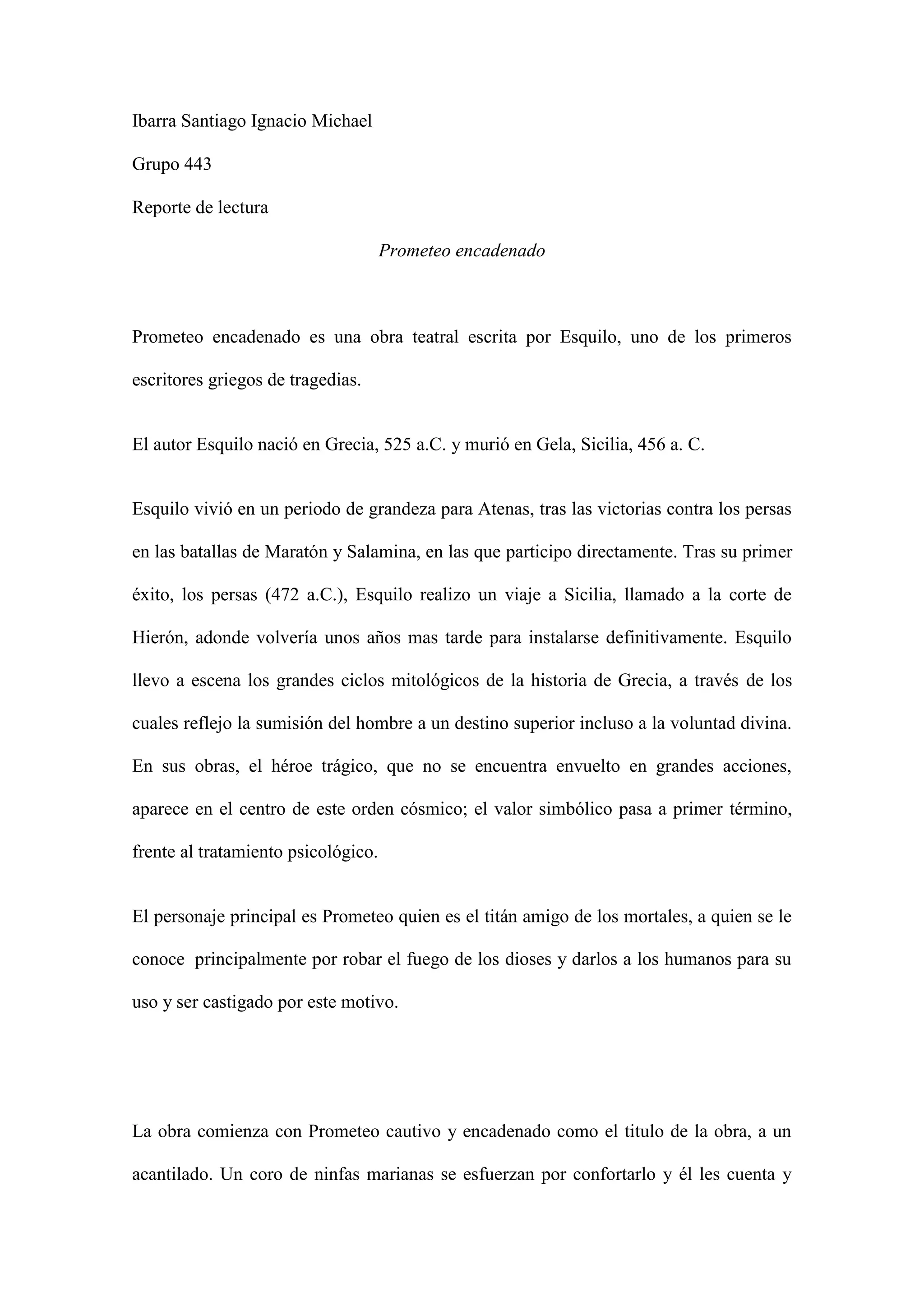 El documento resume la obra teatral Prometeo encadenado, escrita por Esquilo en el siglo V a.C. Prometeo, un titán amigo de los humanos, es encadenado a un acantilado como castigo por haberles dado el fuego a los hombres. A lo largo de la obra, Prometeo profetiza el futuro de personajes como Io y amenaza a Zeus con revelar un secreto. Finalmente, Zeus lo amenaza con enviar un águila a devorar sus entrañas si no habla. La obra sigue las convenciones de la traged