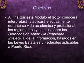 Este documento presenta un módulo sobre derechos de autor que incluye objetivos, introducción, historia reciente, definiciones de derechos de autor, obras protegidas y no protegidas, duración de la protección, leyes como el DMCA y conceptos como uso justo. El módulo provee una introducción general a los principios y leyes de derechos de autor aplicables a Puerto Rico.