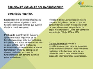 El documento analiza las principales variables del macroentorno que afectan a una empresa energética. Identifica factores como la reducción de las primas a la energía eólica y solar, el descenso del consumo energético debido a programas de eficiencia, y el ligero crecimiento del PIB que puede aumentar el consumo. También señala oportunidades como los cambios en los estilos de vida que favorecen las energías limpias y la legislación que permite a la empresa ser comercializadora.