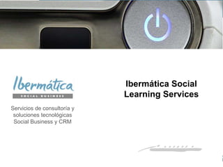 Este documento presenta los servicios de aprendizaje y colaboración (Social Learning) de Ibermática, incluyendo soluciones de aprendizaje en línea (eLearning), gestión del aprendizaje (LMS), comunidades de práctica y portales de aprendizaje social. Describe el modelo de negocio de Learning Office, casos de éxito con grandes clientes, y las tecnologías líderes utilizadas como Moodle, Drupal Commons y Saba.