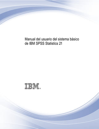 Este manual describe el uso del software IBM SPSS Statistics 21. Explica la interfaz gráfica de usuario y proporciona información sobre cómo abrir y analizar datos. También describe las diferentes opciones disponibles como mejoras adicionales al sistema básico como estadísticas avanzadas, bootstrapping, categorías y muestreo complejo. El manual ofrece instrucciones sobre cómo obtener ayuda y asistencia técnica.