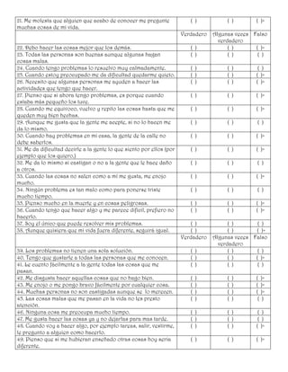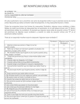 Este documento presenta una versión modificada del Inventario de Creencias Irracionales de Jones (IBT) diseñado para medir creencias irracionales en niños de 8 a 12 años. El IBT original fue adaptado y estandarizado para población colombiana. La versión para niños contiene 49 afirmaciones que miden 11 creencias irracionales como necesidad de aprobación, culpar a otros, autoexigencia, tolerancia a la frustración, entre otras. Los niños deben indicar si están de acuerdo o no con cada afirmación sele