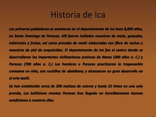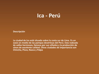 Ica es una ciudad peruana ubicada en la costa sur central, a 303 km de Lima. Es conocida por sus viñedos y producción de vinos de alta calidad. Algunos lugares turísticos notables incluyen la Plaza de Armas, las dunas de Huacachina y las Líneas de Nazca. La gastronomía local destaca el carapulcra y el arroz con pato, mientras que festividades como el Señor de Luren y la Vendimia atraen visitantes.