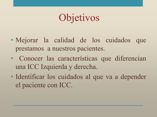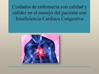 El documento habla sobre el cuidado de pacientes con insuficiencia cardíaca congestiva. Explica que la insuficiencia cardíaca ocurre cuando el corazón no puede bombear suficiente sangre para satisfacer las necesidades del cuerpo. Describe las diferencias entre la insuficiencia cardíaca izquierda y derecha, así como los síntomas asociados a cada una. Finalmente, enumera algunos de los cuidados de enfermería importantes para estos pacientes como controlar signos vitales, dieta, actividad y balance de fluidos.