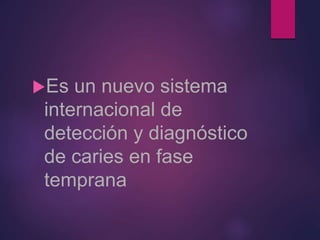 El documento describe el sistema ICDAS para la detección y diagnóstico temprano de caries. ICDAS proporciona 7 categorías que van desde dientes sanos hasta caries que exponen la dentina. El sistema brinda una forma estandarizada de evaluar y codificar caries para estudios epidemiológicos. El protocolo de ICDAS incluye limpiar los dientes, examinar superficies húmedas y secas, e inspeccionar con sonda para identificar lesiones de esmalte y dentina.