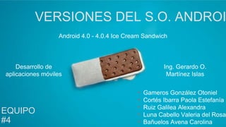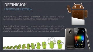 Android 4.0 Ice Cream Sandwich fue la novena versión del sistema operativo Android lanzada en 2011. Se basó en cambios de Android Honeycomb para crear una plataforma unificada para teléfonos y tabletas. Introdujo características como soporte para NFC, reconocimiento facial y de voz mejorado, y el navegador Chrome.