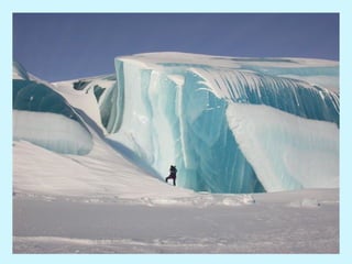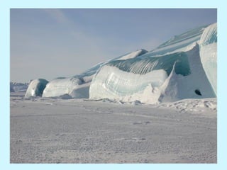 Los icebergs en la Antártida a menudo tienen rayas de diferentes colores formadas por capas de nieve y hielo que se congelan a diferentes velocidades, incorporando sedimentos, burbujas de aire y algas. Un video muestra una ola congelándose instantáneamente al entrar en contacto con el aire extremadamente frío de la Antártida.