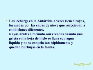 Los icebergs enla Antártida a veces tienen rayas, formadas por las capas de nieve que reaccionan a condiciones diferentes. Rayas azules a menudo son creadas cuando una grieta en la hoja de hielo se llena con agua líquida y no se congela tan rápidamente y quedan burbujas en la forma.