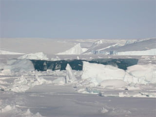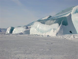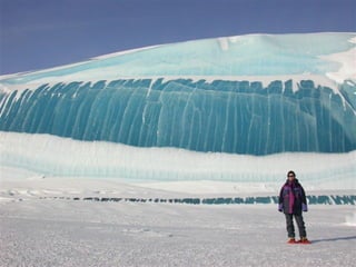 Los icebergs en la Antártida a menudo tienen rayas de diferentes colores formadas por capas de nieve, grietas llenas de agua, y sedimento y algas atrapados en el hielo cuando caen al mar. Una foto muestra una ola congelándose instantáneamente al chocar con el aire frío, ilustrando cómo el clima más frío en la Antártida en la última década ha enfriado el agua a solo unos grados por encima del punto de congelación.