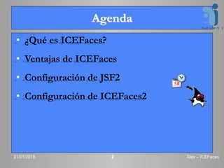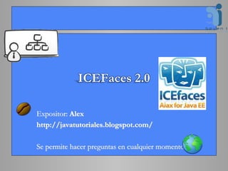 ICEFaces es una extensión AJAX para JavaServer Faces que ofrece componentes para interfaces de usuario, actualizaciones de páginas optimizadas y compatibilidad con otros frameworks. La presentación cubrió qué es ICEFaces, sus ventajas como componentes de interfaz de usuario y actualizaciones del servidor, y ejemplos de configuración de JSF y ICEFaces y aplicaciones como zonas horarias y carritos de compras.