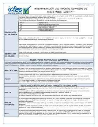 Este documento presenta un informe individual de resultados del examen Saber 11. Incluye la identificación del estudiante evaluado, su colegio, resultados globales e individuales por prueba, y descripciones de los niveles de desempeño. El estudiante obtuvo un puntaje global de 230 y un puesto de 651, con desempeños entre los deciles 1 y 8 en las diferentes pruebas y un nivel A1 en inglés.