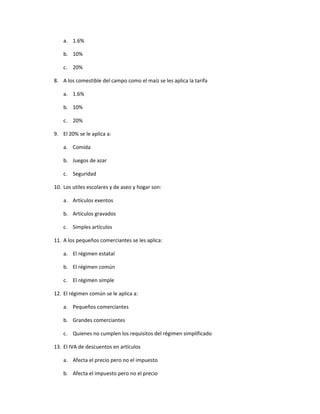 Este documento trata sobre conceptos relacionados con el Impuesto al Valor Agregado (IVA) en Colombia. Explica términos como IVA, ET (Estatuto Tributario), UVT (Unidad de Valor Tributario) y las diferentes tarifas aplicadas (general, diferencial, régimen simplificado). Resume los artículos y sectores a los que se aplican cada una de las tarifas y los regímenes tributarios (común, simplificado).