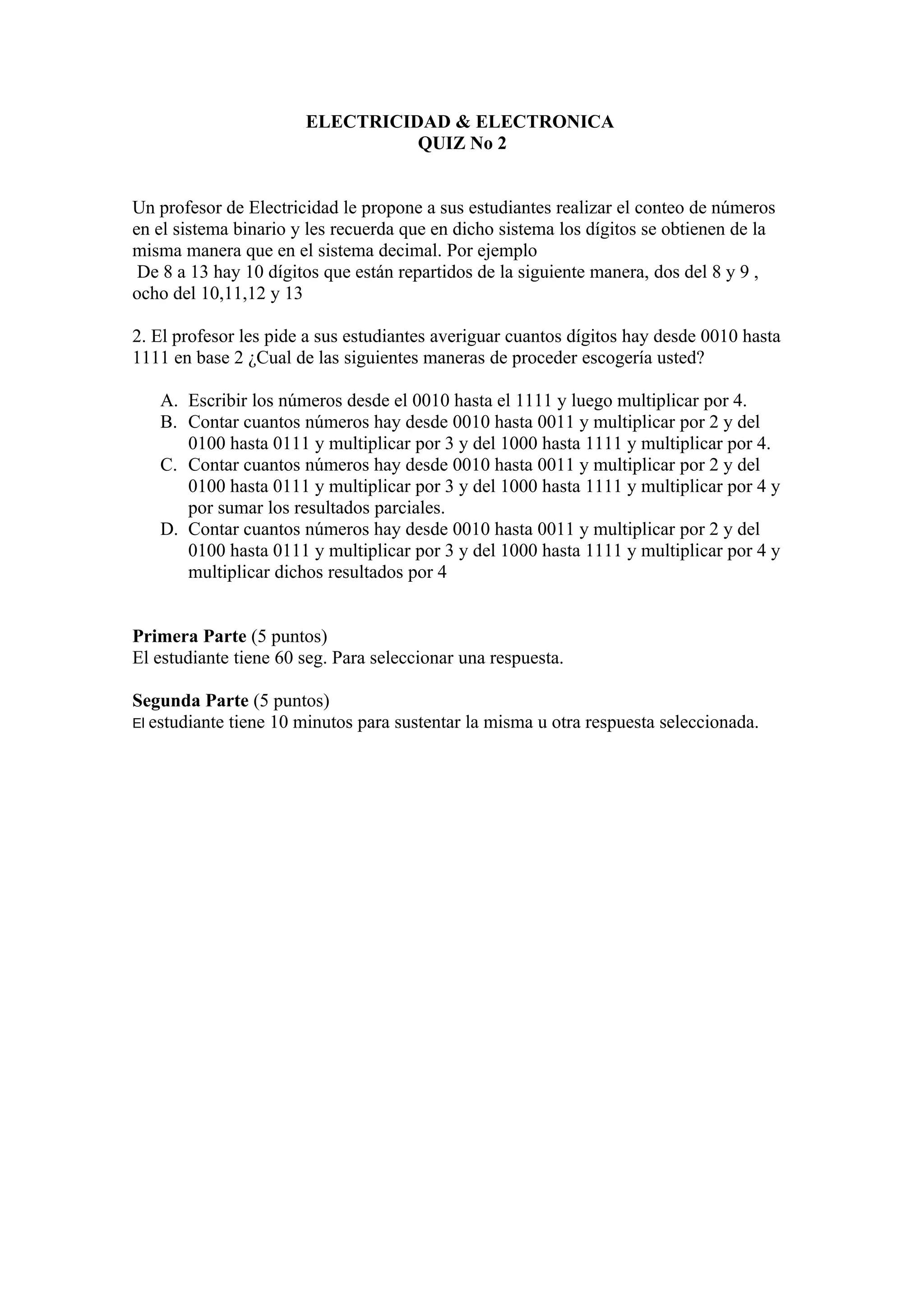 El documento presenta un problema propuesto por un profesor de electricidad y electrónica a sus estudiantes sobre el conteo de números en el sistema binario. El problema pide a los estudiantes averiguar cuántos dígitos hay desde 0010 hasta 1111 en base 2. Las opciones de respuesta proponen diferentes métodos para resolver el problema, incluyendo escribir los números, contar números en rangos y multiplicar los resultados.