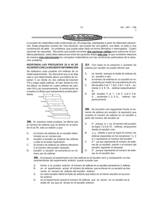La prueba consiste en dejar caer esferas de metal experimental desde una altura. Cada esfera se divide en dos de la mitad del volumen original, y así sucesivamente. El documento contiene preguntas sobre el número de esferas por escalón.