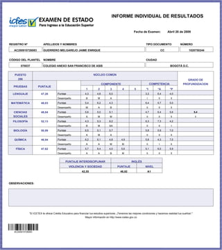 Este informe individual de resultados presenta los puntajes obtenidos por Jaime Enrique Guerrero Melgarejo en las pruebas Saber 11 aplicadas en abril de 2009. Los puntajes de Jaime oscilaron entre 47.28 en lenguaje y 52.13 en filosofía. Sus desempeños variaron entre B, M y A, siendo su mejor desempeño en ciencias sociales e inglés donde obtuvo nivel A1. No se reportaron observaciones adicionales.