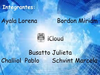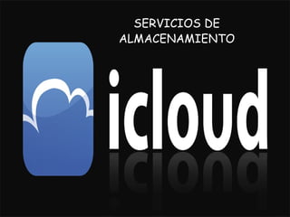 Este documento describe los servicios de almacenamiento en la nube como iCloud y Dropbox. ICloud es un servicio de Apple que ofrece 5GB de almacenamiento gratis y permite sincronizar archivos entre dispositivos Apple. Dropbox permite almacenar archivos en la nube y acceder a ellos desde cualquier dispositivo mediante la descarga de una aplicación. Existen diversos servicios de almacenamiento que varían en capacidad y funcionalidades.