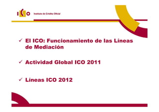 El documento describe varias líneas de financiación ofrecidas por el Instituto de Crédito Oficial (ICO) en España. Resume la naturaleza del ICO como entidad pública de crédito y describe algunas de sus líneas clave para 2012, incluidas líneas para emprendedores, inversión, internacionalización, liquidez y garantías.