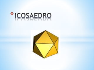 El documento describe las propiedades de un icosaedro regular. Tiene 20 caras triangulares congruentes, 12 vértices con 5 aristas concurrentes cada uno, y 30 aristas. Es uno de los sólidos platónicos y tiene simetría total de orden 120.