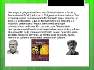 Los antiguos griegos estudiaron los sólidos platónicos, incluyendo el tetraedro, el cubo, el dodecaedro, el octaedro y el icosaedro. Pitágoras descubrió algunos de estos sólidos, mientras que Teeteto dio las primeras descripciones matemáticas de los cinco sólidos regulares y demostró que no había más. El icosaedro tiene 20 caras triangulares equiláteras, 30 aristas y 12 vértices.