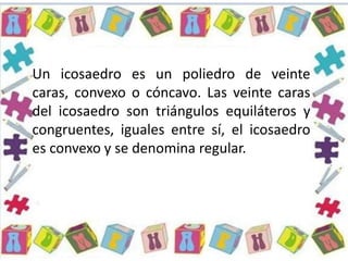 Un icosaedro es un poliedro de 20 caras en forma de triángulos equiláteros congruentes. Tiene 20 caras, 30 aristas y 12 vértices donde coinciden 5 aristas. Su área se calcula como A= 5 . 4√3.a2 y su volumen como V= 5⁄12 (3+√5)a3.