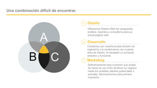 Icowork ofrece servicios de diseño web, desarrollo de sistemas a medida y estrategias de posicionamiento digital para ayudar a las empresas a mejorar su presencia en línea. Su enfoque se centra en crear soluciones atractivas y funcionales adaptadas a las necesidades del cliente, garantizando usabilidad y responsividad en diferentes dispositivos. Además, gestionan campañas de marketing y redes sociales para potenciar la visibilidad y el branding de sus clientes en Internet.