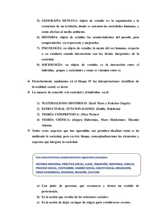 Este documento resume los conceptos básicos para el estudio de fenómenos sociales contemporáneos. Explica los tipos de conocimiento y las ciencias sociales, incluyendo su objeto y campo de estudio. Define conceptos clave como sociedad, grupo social, clase social, cultura, identidad, migración, cambio social y práctica social. El documento describe cómo el hombre se ha organizado socialmente a lo largo de la historia y las características fundamentales de una sociedad.