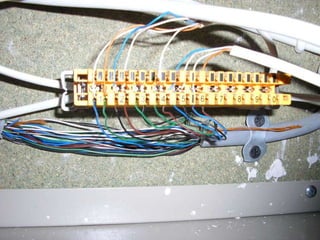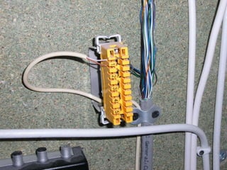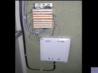 Este documento establece las normas técnicas para el diseño y dimensionado de redes de cable de pares para telefonía. Describe los componentes de la red como el punto de interconexión, la red de distribución, la red de dispersión y el punto de acceso al usuario. Además, especifica los criterios para prever la demanda de líneas, dimensionar las redes de alimentación, distribución y dispersión, y los materiales apropiados como cables multipares y elementos de conexión.