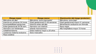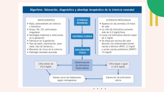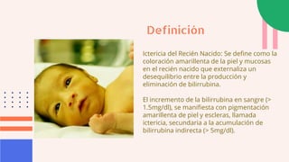 La ictericia neonatal se define como la coloración amarillenta de la piel y mucosas en el recién nacido causada por un desequilibrio entre la producción y eliminación de bilirrubina. Puede ser fisiológica, secundaria a la lactancia, o patológica. El tratamiento depende del tipo de ictericia y puede incluir fototerapia, exanguinotransfusión o medicamentos. La prevención y el manejo adecuado buscan evitar daños neurológicos por niveles altos de bilirrubina