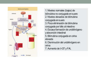 La ictericia es una acumulación anormal de bilirrubina en la sangre que causa amarillez en la piel. Puede ser pre-hepática debido a una elevada destrucción de glóbulos rojos, intra-hepática por una disminución en la captación o conjugación hepática de bilirrubina, o post-hepática por una obstrucción del flujo biliar. Algunas causas comunes son la ictericia fisiológica neonatal, hepatitis, colelitiasis y tumores obstructivos de las vías biliares.