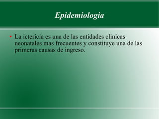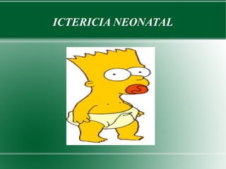 Este documento trata sobre la ictericia neonatal. Explica la epidemiología, el metabolismo, los diagnósticos y tratamientos de la ictericia fisiológica y no fisiológica. Detalla los mecanismos fisiológicos que contribuyen a la ictericia neonatal, así como las causas y tratamientos de la hiperbilirrubinemia, incluyendo la fototerapia y la exanguinotransfusión. Finalmente, describe la patología del kernicterus y sus secuelas neurológicas si no se trata