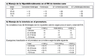 Este documento trata sobre ictericia neonatal. Resume las causas, tipos, factores de riesgo, clasificación, síntomas y manejo de la ictericia fisiológica y patológica en recién nacidos. Explica que la ictericia fisiológica es común y transitoria, mientras que la patológica requiere evaluación para identificar posibles enfermedades subyacentes como incompatibilidad sanguínea o trastornos hepáticos. El documento también describe el metabolismo y transporte de la bil