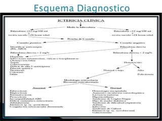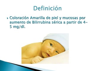 Este documento describe la ictericia en recién nacidos. Explica que la ictericia es el aumento de bilirrubina en la sangre y puede ser fisiológica o patológica. Detalla los factores maternos, perinatales y neonatales que pueden causar ictericia patológica, así como los signos que la distinguen de la ictericia fisiológica. También explica los tratamientos como la fototerapia y la exanguinotransfusión para reducir los niveles de bilirrubina y prevenir