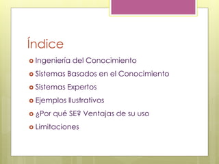 Este documento presenta una introducción a los sistemas basados en el conocimiento. Explica conceptos clave como ingeniería del conocimiento, sistemas expertos y su estructura básica. También describe ventajas de los sistemas expertos como su disponibilidad y coste reducido, así como limitaciones como su falta de sentido común y capacidad de aprendizaje.