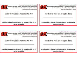 El documento describe un estudio sobre la distribución y abastecimiento de agua potable en el sector Amparito de Cabimas, Venezuela realizado por el Instituto Universitario de Tecnología de Cabimas para el Ministerio del Poder Popular para la Educación Universitaria de Venezuela. El objetivo es recopilar información a través de encuestas sobre el suministro de agua en la zona.