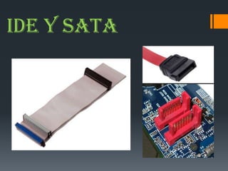 El documento describe las diferencias entre los estándares IDE/PATA e SATA para la conexión de dispositivos de almacenamiento. IDE/PATA fue el estándar original pero ha sido reemplazado por SATA, el cual proporciona mayores velocidades de transferencia, mejor escalabilidad, y cables más largos. SATA opera a 150 MB/s, 300 MB/s, y 600 MB/s para las especificaciones SATA I, II, y III respectivamente.