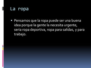 Este documento propone vender ropa deportiva, ropa casual y ropa para el trabajo, así como accesorios como pantalonetas, pantalones, jeans, camisas, camisetas, zapatos y tenis. Recomienda establecer los locales en áreas con poca competencia y con gran cantidad de personas para facilitar las ventas.