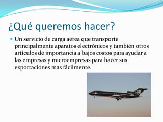 El documento describe un nuevo servicio de carga aérea que transportará electrónicos y otros artículos a bajos costos para ayudar a empresas y microempresas a exportar más fácilmente. Será establecido en el aeropuerto Olaya Herrera por Luis Miguel Parra Rueda y Santiago Jaramillo Gil, y se promocionará por internet, televisión y radio. Se empezará en junio de 2013 con el lugar de trabajo y los fundadores, e invertirá aproximadamente 45 mil millones de pesos colombianos.