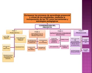 El documento describe un proyecto dirigido a enriquecer los procesos de aprendizaje presencial y virtual de los estudiantes a través de la incorporación de las TIC. Se detalla la estructura del proyecto en fases, que incluyen la definición de objetivos, capacitación de la comunidad educativa y realización de actividades pedagógicas. El objetivo final es mejorar las estrategias educativas y la evaluación del aprendizaje mediante recursos tecnológicos.