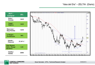 Este documento recomienda comprar acciones de ZELTIA con un precio de entrada de 1,64€, un objetivo de 1,99€ y un stop loss de 1,49€. La ponderación recomendada es del 50% y el potencial de ganancia es del 21,34% con una relación riesgo-beneficio de 2,33. La validez de la recomendación es hasta el 28 de junio.
