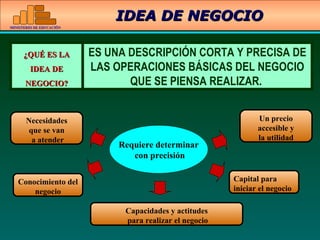 El documento proporciona información sobre cómo identificar y evaluar ideas de negocio. Explica que una buena idea de negocio debe satisfacer una necesidad del cliente y especificar el producto o servicio, cliente objetivo y forma de venta. Además, detalla fuentes potenciales de ideas como necesidades insatisfechas, habilidades personales y cambios tecnológicos. Finalmente, presenta procedimientos como identificar necesidades, generar ideas, seleccionar una idea viable y analizar su fortalezas, debilidades y entorno.