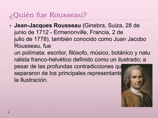 Rousseau fue un filósofo y escritor suizo-francés del siglo XVIII que propuso ideas pedagógicas revolucionarias en su obra "El Emilio". Rousseau creía que la educación debía centrarse en las necesidades e intereses del niño y permitir que sus potencialidades se desarrollen naturalmente, sin imposiciones externas. También pensaba que los niños aprenden mejor explorando el mundo por sí mismos a través de sus sentidos y motivaciones intrínsecas, en lugar de memorizar lecciones. Algunas de
