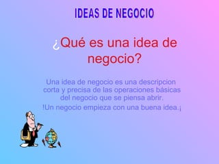 El documento describe los pasos para desarrollar una buena idea de negocio. Explica que una idea de negocio debe identificar el producto o servicio, clientes objetivo, forma de venta y necesidad que satisfará. Además, detalla 5 pasos clave: 1) identificar necesidades locales, 2) generar ideas de negocio, 3) realizar un macrofiltro, 4) realizar un microfiltro, y 5) hacer un análisis FODA para seleccionar la mejor idea.