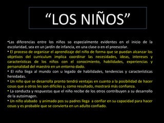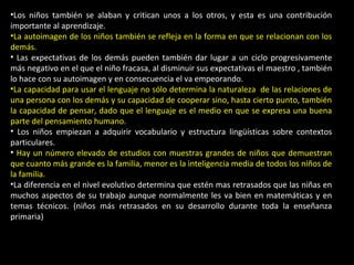 El documento discute varios factores que afectan el desarrollo de los niños, incluyendo las diferencias individuales evidentes al comienzo de la escolaridad, cómo el proceso de enseñanza debe coordinar las necesidades de los niños con las habilidades del maestro, y cómo la conducta y respuestas de otros contribuyen a la autoimagen del niño. También explora cómo el tamaño de la familia, el género y las expectativas de los demás pueden influir en el rendimiento y desarrollo del niño.