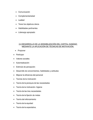 El documento describe las principales responsabilidades y competencias de la gerencia de recursos humanos. La gerencia es responsable de planificar los recursos humanos, reclutar, seleccionar, capacitar y evaluar al personal. También se encarga de integrar y dirigir equipos de trabajo, motivar al personal mediante diferentes técnicas y teorías, y proveer liderazgo e integrar la cultura organizacional.