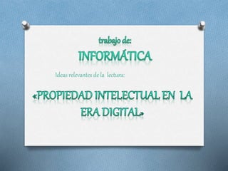 El documento analiza cómo el auge de Internet y la tecnología digital han afectado al derecho de autor y la propiedad intelectual. Internet ha hecho que los autores pierdan el control sobre la explotación de sus obras y ha planteado desafíos como la inseguridad jurídica transfronteriza. Organizaciones como la OMPI buscan asegurar los derechos de autor en el mundo digital, pero persisten conflictos entre la tecnología, la propiedad intelectual y las definiciones tradicionales de reproducción y distribución.