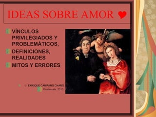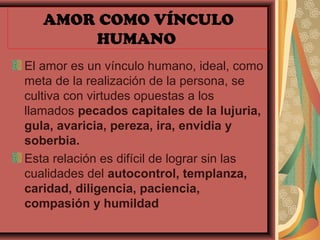 Este documento resume ideas sobre el amor como un vínculo humano privilegiado e íntimo que requiere virtudes como el autocontrol y la compasión. Define el amor como una relación privada, libre y justa que se enfoca en el bienestar mutuo. También describe las fases del amor y los errores comunes como depender solo del atractivo físico o intentar dominar a la otra persona en lugar de respetar su individualidad.
