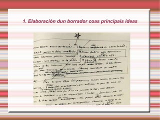La elaboración de un texto escrito consta de 3 fases: 1) Elaborar un borrador con las ideas principales, 2) Organizar las ideas principales y secundarias, 3) Estructurar secuencialmente las ideas.