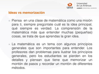 El documento habla sobre la importancia de comprender las ideas y conceptos fundamentales de las matemáticas en lugar de memorizar detalles. Explica que los profesores usan problemas para ilustrar principios generales pero que los estudiantes se pierden en detalles en lugar de captar la gran idea. Finalmente, concluye que las matemáticas requieren comprender pocos conceptos claves en lugar de memorizar mucha información.